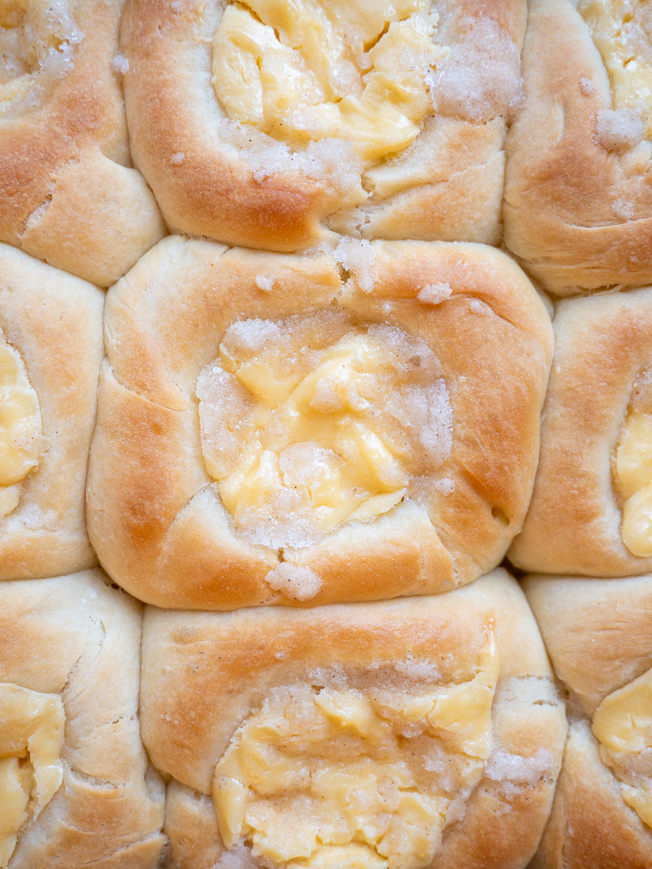Make the filling by whisking together the cream cheese, sugar, egg yolks and some vanilla. Using the bottom of a quarter-cup measuring cup, press down on each dough ball to create a well. Spoon some filling into each hole, about a tablespoon or so. Brush the sides with some melted butter and serve topping, or posipka.